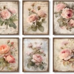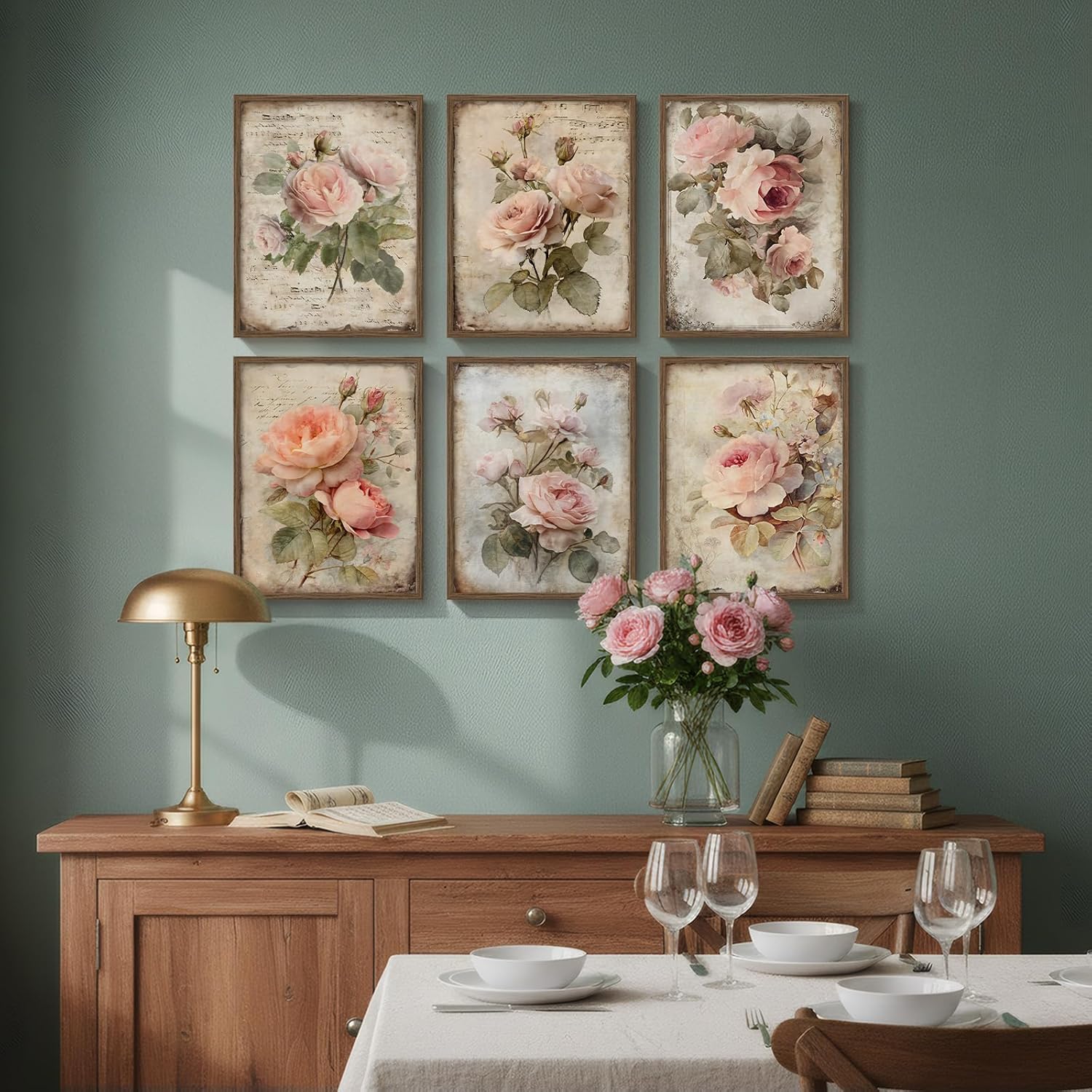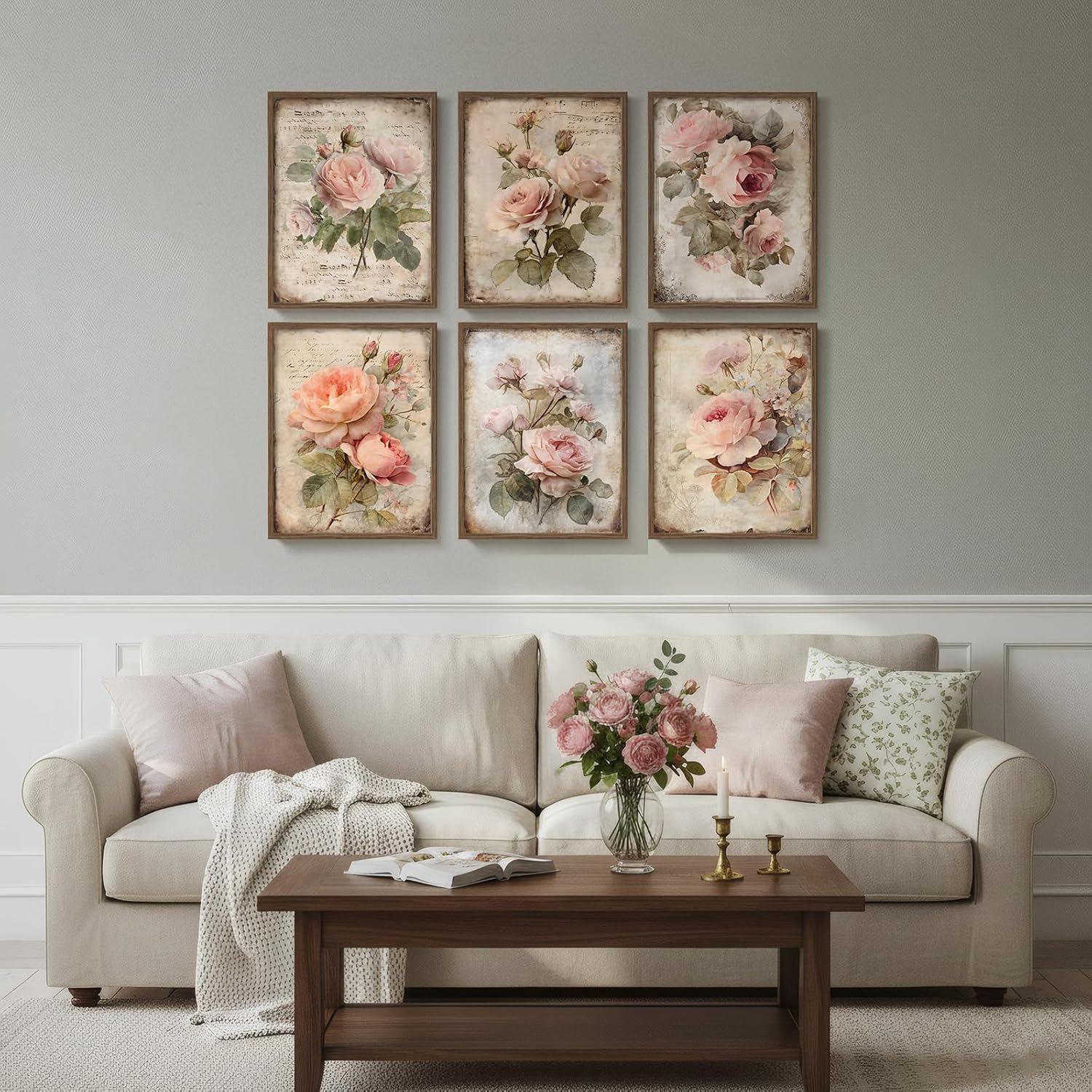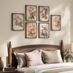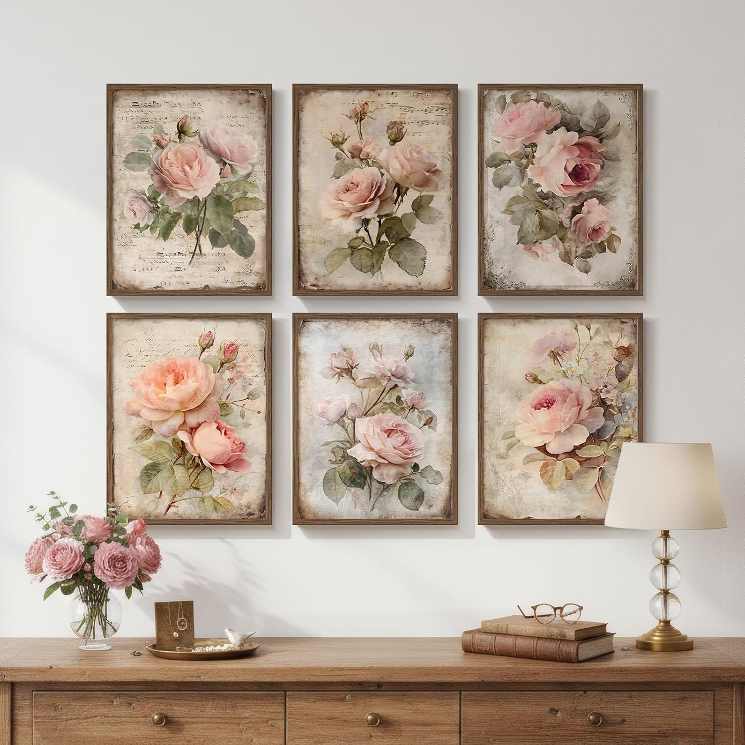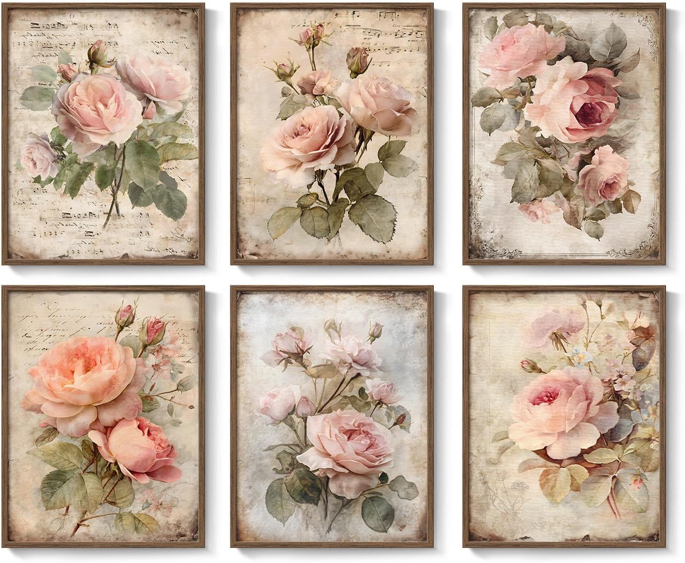 レトロフローラルキャンバスアート6点セット/額縁付き/Rose