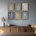 繊細なフラワーイラストを、ベージュ・グレー・ティールの柔らかなニュートラルカラーで仕上げたアートセット。