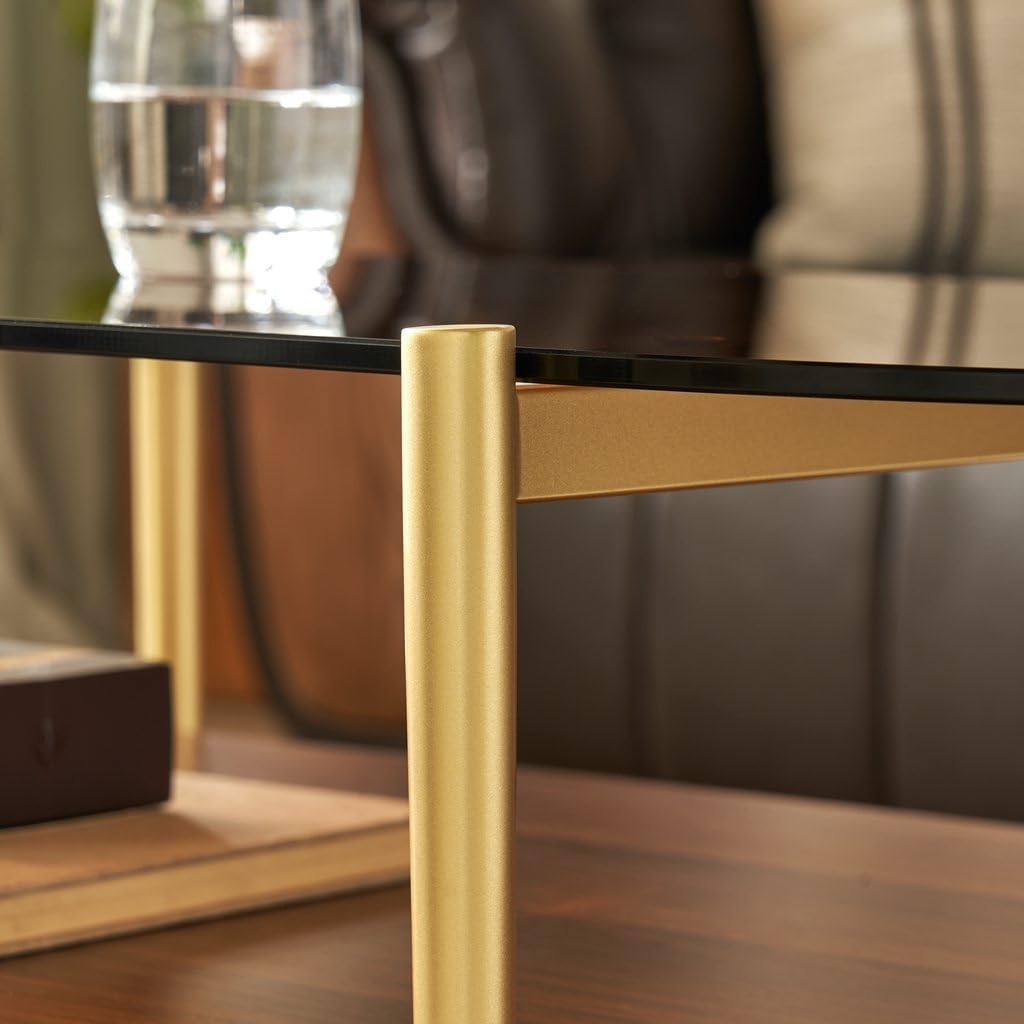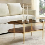 アンバーガラスの天板と、ウッドシェルフが軽やかで洗練された印象を演出します。