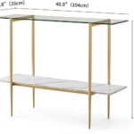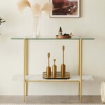すっきりとした円錐型レッグ、クリアガラス天板、ホワイトマーブル調MDFパネルを組み合わせた、上品で洗練されたデザイン。広々とした長方形トップは、インテリア小物のディスプレイやドリンクのサーブ、日常アイテムの置き場として十分なスペースを確保。