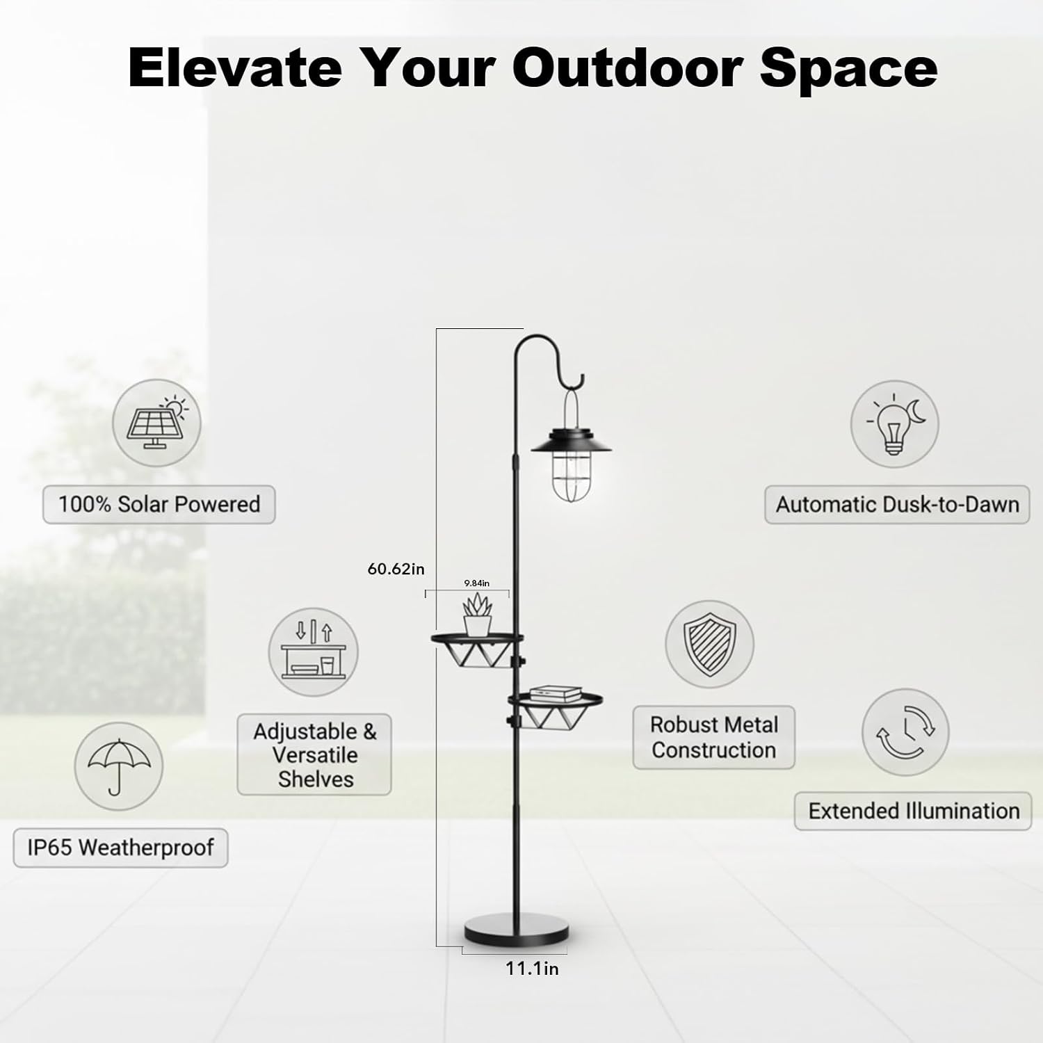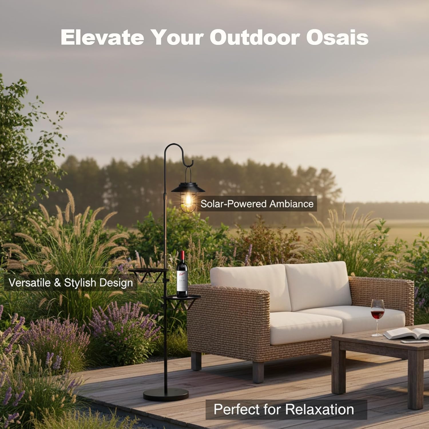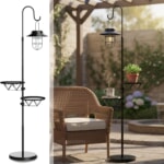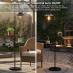 照明とサイドテーブルをひとつにまとめた、実用性の高い屋外用ソーラーフロアランプです。ヴィンテージ感のあるランタンデザインが空間をおしゃれに演出しながら、飲み物や小物を置けるテーブル付きで使い勝手も良好。ソーラー充電式なので電源コードが不要で、パティオやガーデン、バルコニーなどさまざまな屋外空間で手軽にお使いいただけます。
